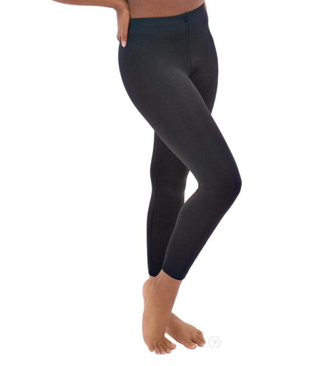 Our classic ankle leggings are lightweight yet supportive, offering the perfect amount of comfort and coverage. The covered elastic waistband stretches and holds for a secure, stay-in-place fit. A discreet, diamond shaped gusset allows for free range of movement. Made with premium microfiber, Eurotard leggings wick away moisture and control odor for a long-lasting fresh and clean feel. Wear these high quality black leggings to the studio, the gym, or in between classes.