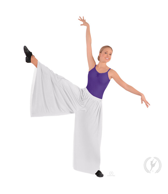 Adult sized classic polyester palazzo pants with covered floating elastic waistband. Cut to desired length, no need to hem.