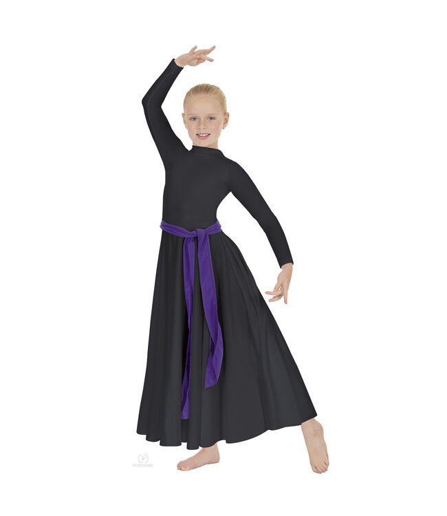 This child sized, long sleeve, full length dress features a high neckline, zipper back, flattering ‘V’ waist line, hemmed sleeves, full length attached sway skirt, lined bodice, and unhemmed skirt bottom so you can cut the dress to any length; the fabric will not unravel or fray.