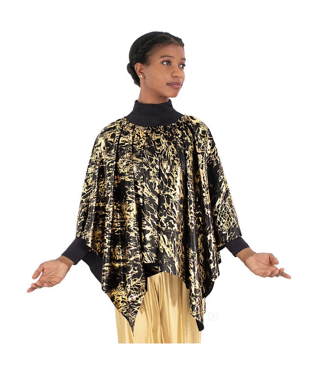 A 3-in-1 handkerchief style overlay with an elastic waistband. Wear as a skirt, drape, or one shoulder style. Fabric features beautiful gold foil marble accents.